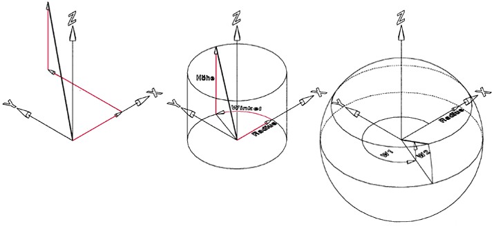 | Koordinaten sind eine geordnete Menge von Werten, die absolut oder relativ, exakt die Lage eines Objekts in einem Koordinatensystem angeben. Unter einem Koordinatensystem versteht man ein Orientierungssystem, das der Festlegung von Punkten im Raum oder in der Ebene dient. Damit grafische Daten in Form von alphanumerischen Werten gespeichert werden können, müssen alle Objekte in einer CAD-Zeichnung bzw. Grafik sowohl in ihrer Größe als auch in ihrer Position eindeutig auf der Zeichenfläche festgelegt werden. Dazu verwenden CAD-Systeme meistens kartesische bzw. polare Koordinatenwerte: Neben der Möglichkeit, CAD- bzw. Grafik-Elemente über die Maus oder den Digitizer