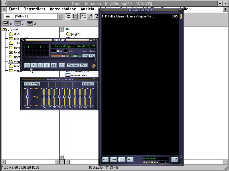 Winamp 5.13 LiteDownload (1,2MB)Universeller Media Player für Windows NT 3.51, der Installer ist komplett unter NT3.51 nutzbar. Bitte Beachten: Vorher das SP5 installieren sonst kann es zu Problemen kommen. Man muss bei der Installation die Visualisierung, Extra Audio Output / Effekts Support und Winamp Agent entfernen. ![]() Bild 1 - Winamp im Einsatz |