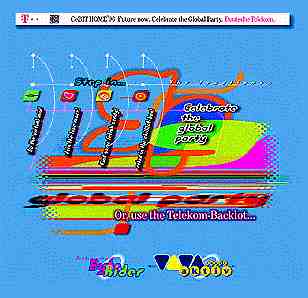 '96 im Netz zu besuchen sein. THE GLOBAL PARTY ist die WebSite der TELEKOM, erdacht als vorauseilendes und begleitendes Messe-Event im Cyberspace. Die Website ist im Stil von Rave gehalten und so auf eine entsprechende Zielgruppe des Internet abgestimmt. Das Entree der Party, die Homepage, führt, neben den Links für die Infopages der TELEKOM, die vier Links der Partylocations auf. Die Locations sind zum Start der GLOBAL PARTY teilweise noch geschlossen, annoncieren aber ein Eröffnungsdatum oder sind durch "Backlots" erreichbar, die "Online-Neugier" wecken. Jede Partylocation hat ein eigens gestaltetes Environment, in dem Sie als User aktiv werden können. Sie sind Teil der Global Party, verfügen unter anderem über das Instrumentarium für einen eigenen Soundmix, "The Virtual Mix", Sie können sich im Labyrinth der Love Maze verlieren, im Fetish Candy ungeahnte Bedeutungen entdecken und in der Chilloutbox durch psychedelische Farbspiele entspannen. Ab dem 28. August sind Sie über Videostandbilder einer WebCamera im Minutentakt bei den Messeereignissen der CeBIT Home dabei. Polygon zeichnet für die Gestaltung, die Konzeption und die Programmierung der kompletten Website sowie der vier Partylocations verantwortlich. POLYGON ist ein interdisziplinäres Team von Produktdesignern, Konstrukteuren, Kommunikationsdesignern, Grafikern, Multimediaspezialisten, Programmierern, Modellbauern, Konzeptionern und Textern. Mit diesem Team sind wir in der Lage komplexe Projekte vollständig abzuwickeln. Projekte lassen sich in kürzerer Zeit realisieren, da eine aufwendige Koordination zwischen den verschiedenen Dienstleistern entfällt. Die Kommunikation funktioniert direkt - wenn es sein muß mit einem Zuruf über den Schreibtisch. Mario Achler Wir laden Sie herzlich zur GLOBAL PARTY ein unter: http://www.globalparty.de Quelle: Pressemitteilung der Firma Polygon vom 15.08.96 | |||||||||||||||||||||||||||