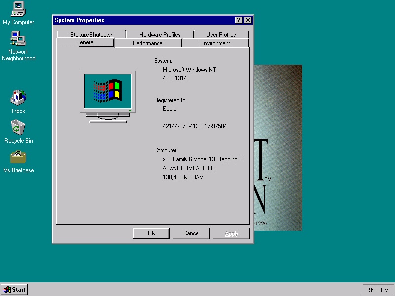 Die Systemeigenschaften haben die deutlichsten Änderungen erhalten, es sieht nun endlich nicht mehr so aus wie in NT 3.51, sondern ähnelt dem von Windows 95 mit mehr Registerkarten. Es zeigt auch die genaue Windows NT-Version an, sowie einiges mehr an Rechnerinformationen.