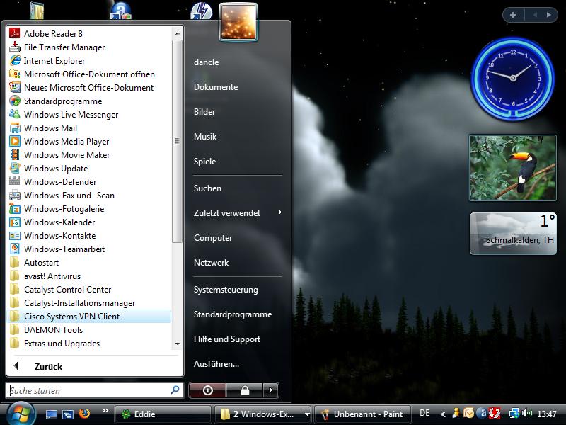 Wie man auf den Screenshot schön sehen kann, hat der Desktop jetzt eine Sidebar bekommen, lange hatte Microsoft überlegt ob Sie überhaupt diese einbauen wollen, aber sie ist doch dazugekommen.