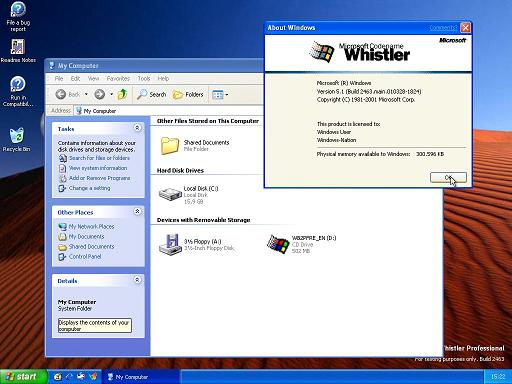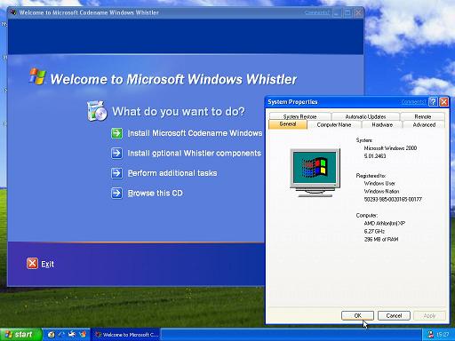 das System geistert. Selbst die "System Properties" zeigen an, dass Windows Whistler Windows NT 5.0 ist.