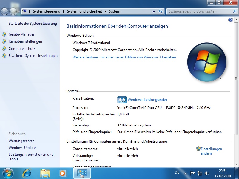 | Die aus Windows Vista gewohnten Systemeigenschaften |