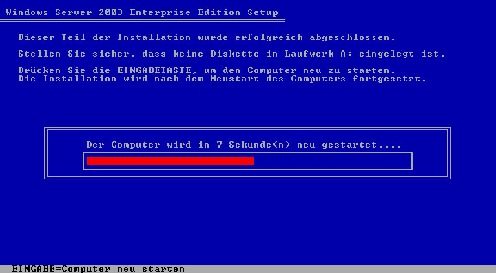 | Der erste Neustart von Windows 2003 und damit Verlassen des DOS-basierten Teils. |