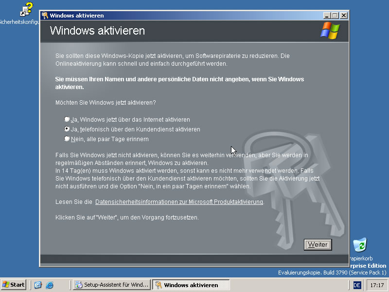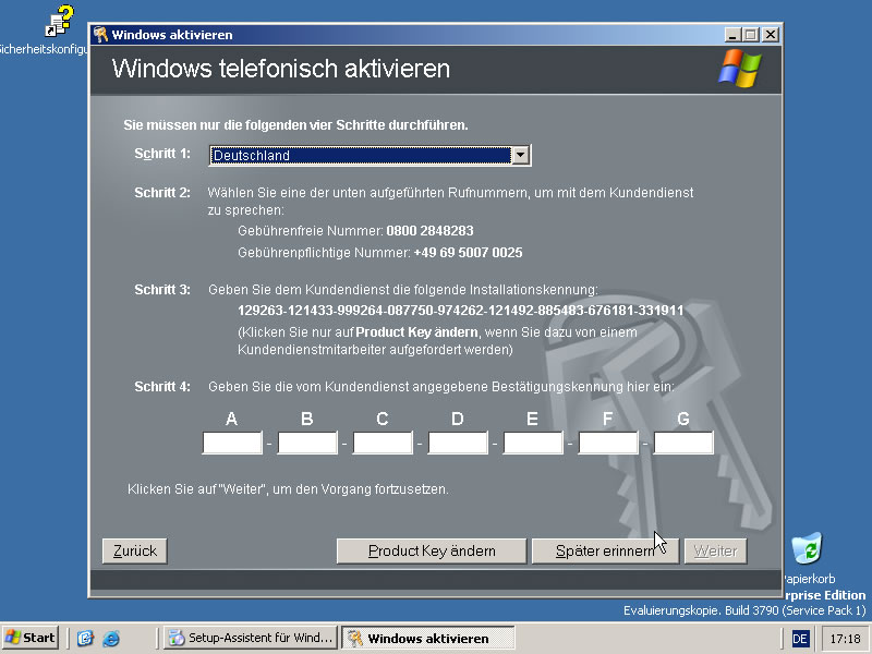 Wie auch schon bei Windows XP und Server 2003 muss diese Windows-Version selbstverständlich in spätestens 14 Tagen aktiviert werden, die Aktivierung per Web und Telefon schlug jedoch zunächst fehl, ich wurde zu einen Service-Mitarbeiter durchgestellt und dann hat auch die Aktivierung geklappt, kann aber auch daran gelegen haben das diese Version nur eine Testversion ist.