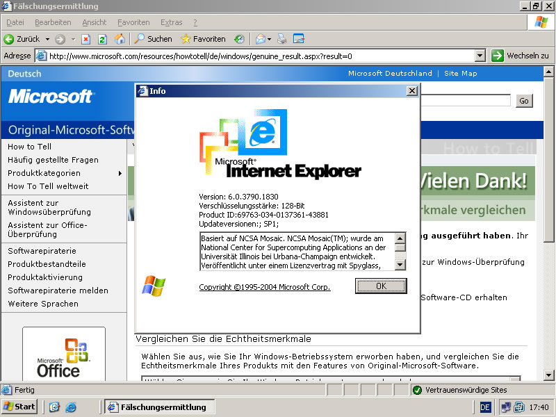| Internet Explorer 6.0 mit 128bit Verschlüsselung, sowie hohen Sicherheitsstandards nur Vertraute Seiten werden geladen. |