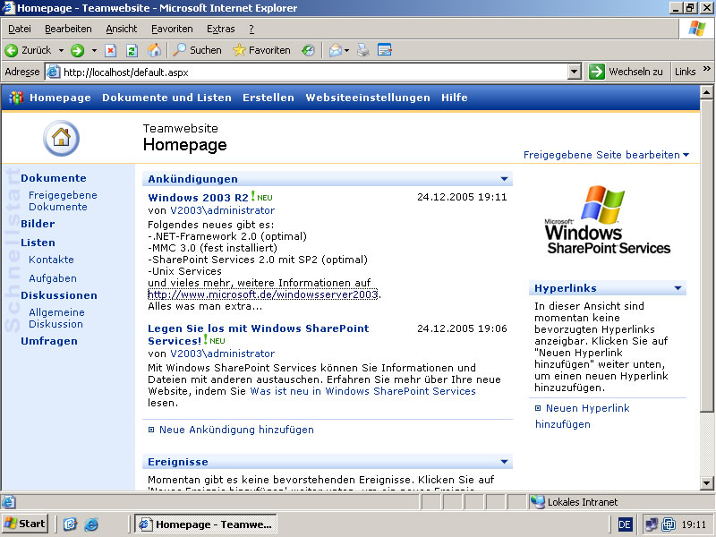 Erfreulicherweise wurden auch die SharePoint Services 2.0 beigefügt, sogar das aktuelle SP2 wurde mit Integriert, das spart Patch-Arbeit.