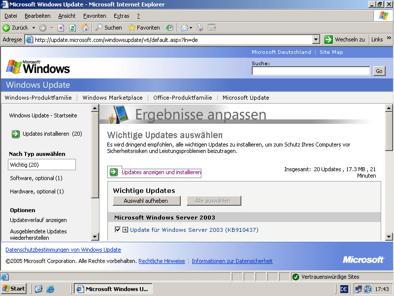 | Windows Update in Version 6.0 es sind schon wieder 20 (17,3MB) Hotfixes notwendig, hart für Modem User. |