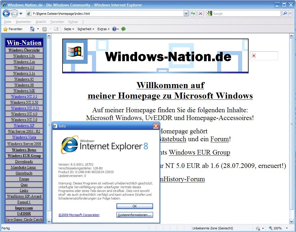 Der Internet Explorer, Version 6.0 ist im Laufe der Zeit auch immer mehr vom neuen Firefox verdrängt worden. Also musste Microsoft handeln und veröffentlichte im Laufe der Jahre mehrere Updates. Mit dem SP2 kam der IE auf Version 6.0 mit SP2, welches aber nur geringe Verbesserungen brachte. 2006 erschien dann das erste Major-Update seit 2001: Internet Explorer Version 7.0 mit einem komplett neuen Aussehen und neuem Namen: Windows Internet Explorer statt Microsoft Internet Explorer. Es wurde mehr auf Sicherheit Wert gelegt und mehr Benutzerkomfort. Der Benutzer kann jetzt sogar Tabbed Browsing nutzen, aber dieses ist auch komplett abstellbar, wenn man den alten Modus mit Fenstern nutzen möchte. Internet Explorer 8.0 kam dann Anfang 2009 und hat endlich den ACID2-Test bestanden und hält sich mehr an Webstandards als jede andere Version des Internet Explorers. Marktanteilmäßig hat er Anfang 2010 den 6.0er und den 7.0er überholt, unter anderem dank Windows 7, welches sich prima verkauft. Internet Explorer 9.0 soll auch noch 2010 kommen, nur wohl nicht mehr für Windows XP.