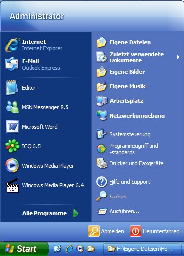 Das Startmenü hat unter Windows XP die größten Änderungen erleiden müssen. Es ist in zweit Teile geteilt: Die rechte Seite ist das normale Startmenü von früher mit geringen Veränderungen und auf der linken Seite sind die letzten aufgerufenen Programme in einer Übersicht. Über beiden Menüs ist der Benutzername und das Avatar des Benutzers. Denn im Anmelde-Screen muss man nicht mehr wie in älteren NT-Versionen Strg+Alt+Entf drücken um sich anzumelden (man kann dies auch einstellen), sondern einfach auf seinen Benutzernamen klicken. Aber das Startmenü kann man den alten Stand von ME bringen. Aber XP hat auch einige Nachteile in der Benutzführung: zu viele Assistenten, z.B. in der Suche, machen Windows für erfahrene Benutzer zu kompliziert und die Abschaltung ist sehr gut versteckt. Da hätte MS vor allem bei der Update-Version achten sollen, das bekannte Windows-Nutzer das System installieren wollen, und diese Assistenten nicht brauchen werden.