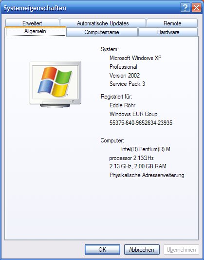 | Die Systemeigenschaften von WinXP mit SP3 zeigen auch, dass ich einen 2.13 GHz-Prozessor verwende, als erstes Windows.: |