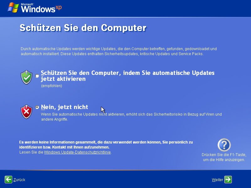 Ist das Sicherheitscenter eingerichtet fragt Windows XP, ob man denn sein Windows auch direkt aktivieren möchte, wenn man dies nicht möchte hat man 30 Tage Zeit, sein Produkt bei Microsoft aktivieren zu lassen.