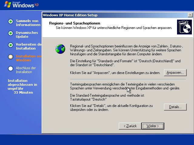 | Regions- und Sprachoptionen schon während des Setups. Und noch 33 Minuten warten. |