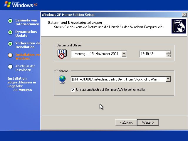 Nach der Sprache muss auch die Zeitzone für den Betrieb von Windows XP richtig eingestellt werden, meist ist diese GMT + 01:00 (Berlin).