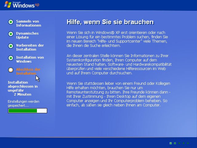 Als nächstes kommt wie in NT 5.0 das Abschließen der Konfiguration. Das Startmenü wird installiert, Komponenten registriert, Systemeinstellungen gespeichert (dauert sehr lange) und die temporären Dateien entfernt. Danach wird unser Windows XP mit integriertem Service Pack 2 neu gestartet.