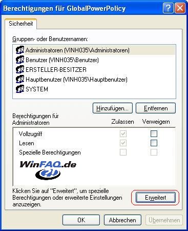 Verändern Sie die Rechte auf die Schlüssel "GlobalPowerPolicy" und "PowerPolicies". Klicken Sie dafür die Schlüssel mit der rechten Maustaste an. Wählen Sie aus dem Kontextmenü den Eintrag "Berechtigungen" aus. Klicken Sie im neuen Fenster "Berechtigungen für [Schlüsselname]" auf den Button "Erweitert"