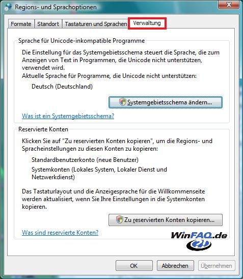 Mit diesem Tipp können Sie den Tabreiter "Verwaltung" von "Regions- und Sprachoptionen" aus der Systemsteuerung entfernen. Wenn Sie den Tipp aktivieren, wird der Eintrag nicht mehr angezeigt, in diesem Bereich können die Einstellungen von "Sprache für Unicode-inkompatible Programme" und "Reservierte Konten" vorgenommen werden.