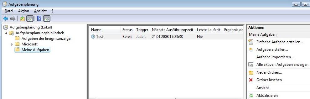 Die von Ihnen erstellen Aufgaben finden Sie direkt in dem Ordner, unter dem die Aufgabe angelegt wurde. Wenn Sie sich an der oben genannten Empfehlung gehalten haben, also im Ordner "Meine Aufgaben" unterhalb der Aufgabenplanungsbibliothek.
