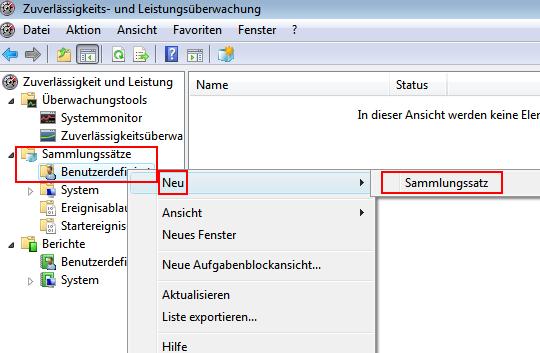 Ein vordefiniertes Protokoll mit den oben erwähnten 3 Werten ist schon als Beispiel vorhanden. Über das Kontextmenü von "Leistungsindikatorenprotokolle" können Sie eigene Protokolle über den Eintrag "Neue Protokolleinstellungen..." hinzufügen.