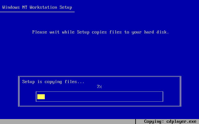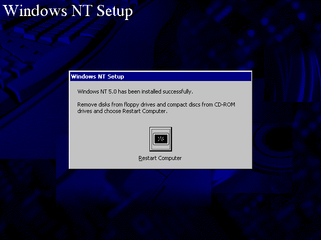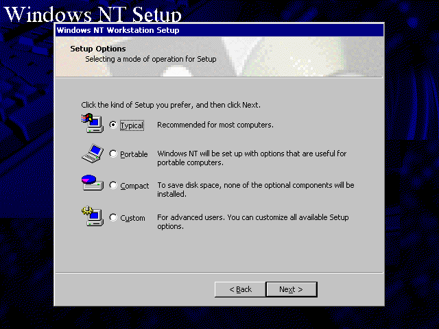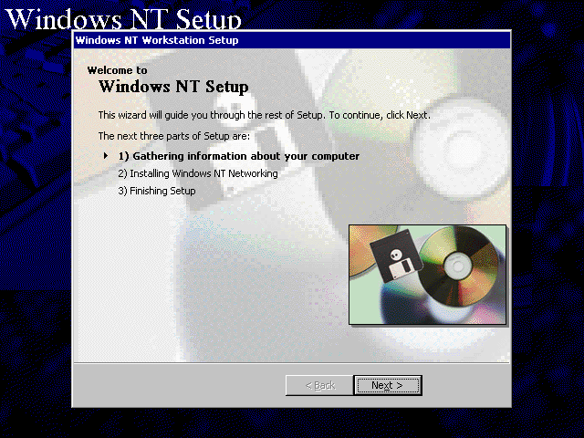 Das Setup hat im Hintergrund noch die alte Grafik aus NT 4, aber das Fenster selbst hat sich relativ stark optisch verändert, es hat einige CDs und Disketten im Hintergrund.