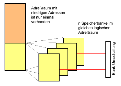 Dabei werden mehrere Speicherbänke von jeweils bis zu 64 KByte im Rechner implementiert. Zu jedem Zeitpunkt ist nur eine Speicherbank freigegeben und somit für Programm und Daten zugänglich. Die Umschaltung auf eine andere Speicherbank erfolgt über einen Speicherbank-Selektor (realisiert als Parallel-AusgabeBaustein), der z. B. mit Hilfe eines Ausgabe-Befehls angesprochen werden kann. Zu Kommunikationszwecken kann ein Speicherbereich allen Speicherbänken gemeinsam zugeordnet werden (Common).