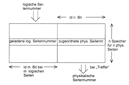 Besonders vorteilhaft für diesen Zweck sind sogenannte Assoziativspeicher (= CAM, Content Addressable Memory), deren Zugriff nicht über eine Adresse, sondern über Zelleninhalte erfolgt. Es wird ein Suchwort (Schlüssel) anstatt der Adresse angelegt und als Ergebnis erhält man eine Trefferanzeige, u. U. auch keinen Treffer. Der Schlüssel ist in diesem Fall die logische Seitennummer, 'Treffer' bedeutet, es existiert ein entsprechender Eintrag in der Tabelle, im speziellen Fall der Adreßumsetzung: die gesuchte logische Seite ist geladen, die eigentliche Information des Tabelleneintrags, die physische Seitennummer, wird ausgelesen.