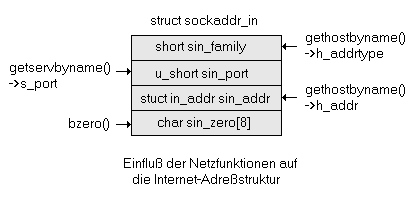 Thema dieses Skripts ist aber ausschließlich die Internet-Domäne. Zur Übergabe der Parameter einer Socketverbindung dienen zwei Strukturen, sockaddr und für die Internet-Protokolle sockaddr_in. Erstere ist so konzipiert, dass sie unabhängig von der verwendeten Adressfamilie ist: