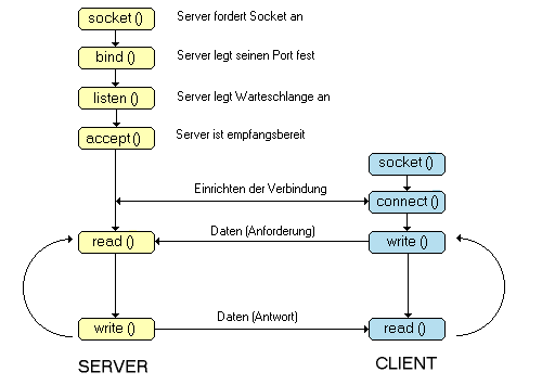 Zur Kommunikation zwischen Prozessen, die auch auf verschiedenen Rechnern ablaufen können, wurde mit den Sockets im BSD-Unix ein leistungsfähiger Mechanismus der Datenübertragung definiert. Sockets sind heute Grundlage der meisten höheren Datenübertragungsprotokolle und in fast allen Betriebssystemen realisiert. Sie stellen die Schnittstelle zwischen Anwendungsprogramm und den Betriebssystemroutinen zur Datenkommunikation dar. Dabei besteht der Vorteil für den Benutzer darin, daß einem Socket ein Dateideskriptor zugeordnet wird, über den das Anwendungsprogramm fast genauso kommunizieren kann, wie über Pipes oder normale Dateien. Im Gegensatz zu einer Pipe, die grundsätzlich nur in einer Richtung betrieben werden kann, ist ein Socket-Deskriptor jedoch bidirektional - wie eine zum Lesen und Schreiben geöffnete Datei. Sockets sind, wie die Client-Server-Beziehung, unsymmetrisch: Einer der beiden beteiligten Prozesse ist "Server", der andere "Client". Der Server (Diensterbringer) wartet darauf, daß irgendein Client (Kunde) mit ihm Kontakt aufnehmen möchte. Der Client ist der aktive Part und veranlasst den Beginn der Kommunikation.