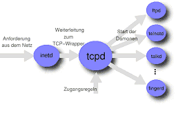 Rein theoretisch müßte jeder Daemon bei Systemstart hochgefahren werden, für die eine Anforderung eines entfernten Rechner (Host) auftreten könnte. Dies würde aber die Zahl der laufenden Prozesse unnötig in die Höhe treiben und Systemresourcen verbrauchen. Deshalb wurde der Daemon inetd, der Internet-Superserver, entwickelt. Er "lauscht" auf alle Diensteanforderungen, die an dem von ihm überwachten Ports eingehen. Tritt eine solche Anforderung auf, prüft der Daemon die Zugriffsberechtigung (exakt: Die Kontrolle wird an den TCP-Warapper tcpd übergeben und dieser macht weiter) und startet im positivem Fall den entsprechenden Daemon, der dann die Anforderungen des Clients bearbeitet. Die Konfigurationsdatei ist /etc/inetd.conf. In ihr sind alle Dienste und die entsprechenden Dämonen mit Parametern verzeichnet.