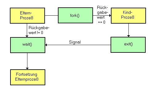 Die Systemaufrufe fork(), exec() und wait() haben mit der Generierung von Kindprozessen zu tun und erlauben die Synchronisation zwischen Eltern- und Kindprozessen. An dieser Stelle wird nur soweit darauf eingegangen, wie es zum Verständnis der folgenden Abschnitte nötig ist.