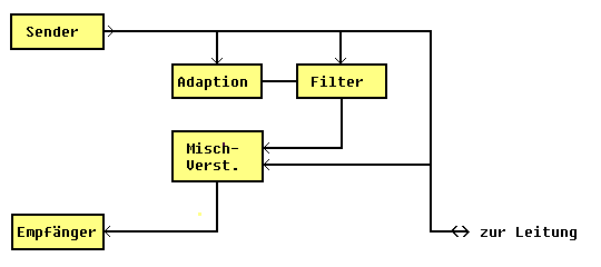 Damit die Übertragung trotz der relativ hohen Datenrate störungsfrei verlaufen kann, wird durch eine Adaptionslogik und ein gesteuertes Filter das ISDN-Gerät an die Eigenschaften der Leitung angepaßt, um so Störungen optimal auszufiltern. Das folgende Diagramm zeigt schematisch den Aufbau.