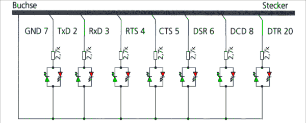 Da bei der V.24-Schnittstelle 0 und 1 durch eine positive bzw. negative Spannung von 5...12 V repräsentiert werden, kann man den Zustand der einzelnen Leitungen sofort ablesen. Führt man die Verbindungen über ein Steckerfeld, kann man die einzelnen Pins auch gekreuzt verdrahten, wenn man z. B. zwei Computer koppeln möchte. Dazu müssen aber keineswegs alle Leitungen überwacht werden. Es genügen normalerweise die Anschlüsse, die in der folgenden Tabelle aufgelistet sind.