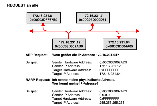 Die Station A will Daten an eine Station B mit der Internetadresse I(B) senden, deren physikalische Adresse P(B) sie noch nicht kennt. Sie sendet einem ARP-Request an alle Stationen im Netz, der die eigene physikalische Adresse und die IP-Adresse von B enthält.