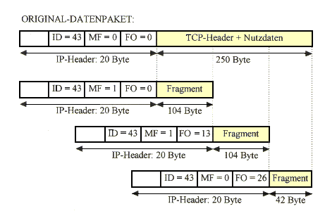Es soll ein TCP-Paket mit einer Länge von 250 Byte über IP versandt werden. Es wird angenommen, daß ein IP-Header eine Länge von 20 Byte hat und eine maximale Länge von 128 Byte pro Paket nicht überschritten werden darf Der Identifikator des Datagramms beträgt 43 und der Fragmentabstand wird in 8-Byte-Schritten gezählt. Das Datenfragment muß also durch 8 dividierbar sein.