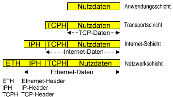 Auf der Netzwerkschicht aufbauend liegt die Internet-Schicht, die die erste Abstraktionsschicht vom Transportmechanismus darstellt. Auf dieser Schicht 3 stellt das Internet-Protokoll (IP) den grundlegenden Netzdienst zur Verfügung, den Versand von Datenpaketen, sogenannten Datagrammen, über verschiedene Netze hinweg. Die Netzwerkschicht hat keine Information darüber, von welcher Art die Daten sind, die sie befördert. Nehmen wir als Beispiel das Ethernet: Von der Ethernet-Karte werden die vom Netz kommenden Daten an die Treibersoftware für die Karte weitergereicht. Diese interpretiert einen Teil dieser Daten als IP-Header und den Rest als Datenteil eines IP-Paketes. Auf diese Weise ist der IP-Header innerhalb eines Ethernet-Paketes eingekapselt. Aber auch das IP-Paket selbst enthält wieder ein Datenpaket für eine höhere Protokollebene (TCP), dessen Header auf der IP-Ebene als Bestandteil der Daten erscheint. Man kann sich das so vorstellen, wie die russischen Puppen, die ineinandergeschachtelt sind. Die kleinste Puppe ganz innen repräsentiert die Nutzdaten, alle außen herum geschachtelten Puppen sind 'Protokoll-Verpackung'.