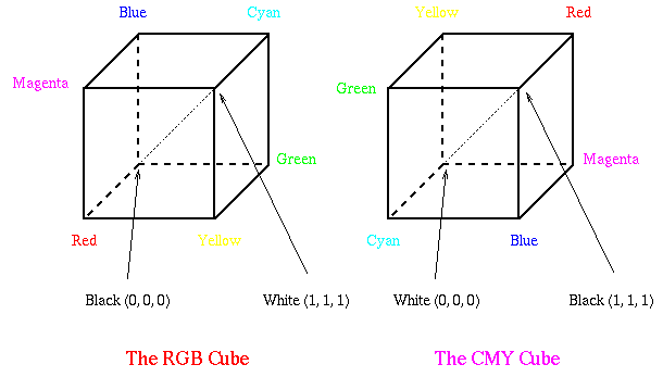 Beim RGB-Modell werden die darstellbaren Farben als Punkte eines im Ursprung eines Kartesischen Koordinatensystems liegenden Einheitswürfels beschrieben. Auf den positiven Achsen dieses Koordinatensystems werden die drei Primärfaben Rot, Grün und Blau aufgetragen. Die Hauptdiagonale des Einheitswürfels, sie geht vom Punkt (0,0,0) zum Punkt (1,1,1), enthält die Farben mit gleich großem Anteil an allen Primärfarben. Sie repräsentiert die Grauwerte, wobei Schwarz im Ursprung (0,0,0) und Weiß im Punkt (1,1,1) liegen. Eine Farbe wird dann durch die Anteile an den drei Primärfarben beschrieben, die zur Farbe Schwarz addiert werden.
