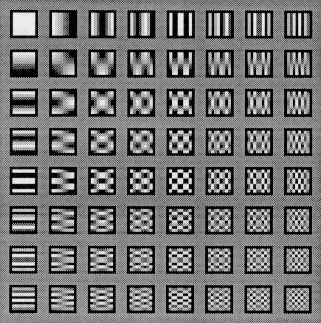 Das folgende Bild zeigt die 8 x 8 = 64 DCT-Basisfunktionen. Links oben ist F(0,0) (der DC-Anteil), rechts untern der höchste AC-Anteil.