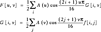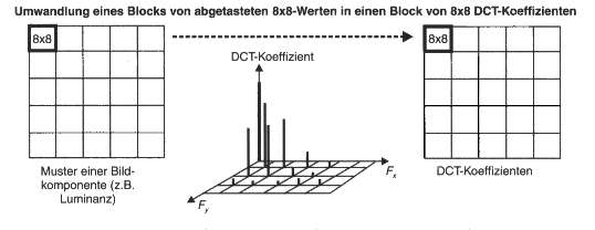Das menschliche Auge ist kein perfektes Organ. So kann es zum Beispiel weiche Farbübergänge viel schlechter auflösen als geringe Helligkeitsunterschiede. Dabei spricht man bei Farbunterschieden, die das Auge besser auflöst von niedrigen Ortsfrequenzen, bei schlechterer Auflösung von hohen Ortsfrequenzen. Die Analogie zu Frequenzen führt von dem räumlichen Auflösungsvermögen des Auges her. Bei bestimmten Farbunterschieden kann man mehr unterscheidbare Farbinformationen unterbringen (daher hohe Ortsfrequenz) als bei anderen Farbunterschieden. Die DCT nutzt nun diese Schwäche des menschlichen Auges aus, indem sie die hohen Ortsfrequenzen herausfiltert und diese schlechter oder auch gar nicht codiert. Zunächst werden die Eingangsdaten, die als vorzeichenlose Ganzzahlen vorliegen, in eine für die DCT geeignete Wellenform gebracht. Dazu subtrahiert man einfach von jedem Wert (2 hoch P-1), wobei P die verwendete Genauigkeit in Bits darstellt. Im Baseline Codec beträgt die Genauigkeit 8 Bit, so daß der neue Referentzpunt beim Wert 128 liegt. Dann werden die Bilddaten in Blöcken zu 8x8 Pixeln gerastert. Ein solcher Block wird nun als Vektor (aus 64 Pixelwerten) eines geeigneten Vektorraums interpretiert. Die DCT vollzieht nun einen Basiswechsel. F(u,v) ist der DCT-Koeffizient, f(i,j) der geshiftete Pixelwert.
