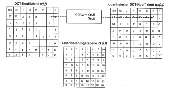Die Umkehrabbildung multipliziert dann einfach den quantisierten Wert mit dem Quantisierungsfaktor. Durch diese Hin- und Zurücktransformation entsteht ein Informationsverlust, da bei dieser Rückrechnung die quantisierten Werte nicht immer auf den originalen Wert zurückführen. Je größer dabei der Quantisierungsfaktor ist, desto größer ist auch der Informationsverlust. Dieser Informationsverlust kann durch geeignete Wahl der Quantifizierungsfaktoren so gering gehalten werden, daß er vom Auge kaum wahrgenommen werden kann. Kompressionsraten von < 1:10 sind hierbei leicht realisierbar, ohne daß beim rekonstruierten Bild große Unterschiede zum Original zu erkennen sind.