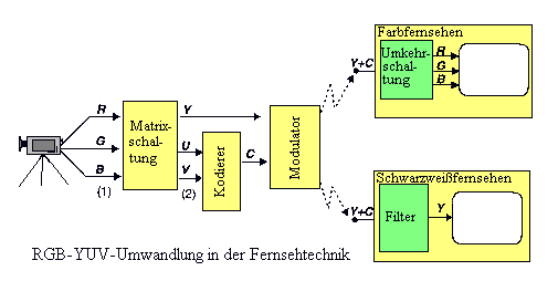 In der Fernsehtechnik wird das Luminanzsignal Y-Signal genannt. Die zwei Chrominanzsignale werden aus den Farbunterschieden herechnet. Ein Farbunterschiedssignal für Rot, Grün und Blau entsteht durch Suhtrahieren des Luminanzsignals vom Farbsignal. ist beispielsweise R das Farbsignal Rot, ist das Farbunterschiedssignal von Rot (R - Y). In der Praxis genügen zwei Farbunterschiedssignale, wenn Luminanz verfügbar ist. Farbunterschiedssignale werden nicht so übertragen wie sie sind, sondern vor der šbertragung in zwei Signale - die Cbrominanzsignale - umgewandelt. Die Umwandlung ist linear. Jede Femsehnorm definiert ihre eigene Umwandlungsmethode: