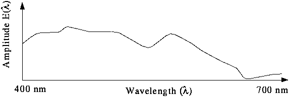 Eine aus nur einer Wellenlänge bestehende Lichtquelle ist eine monochromatische Quelle. Nehmen wir als Beispiel an, darf die Wellenlänge dieser monochromatischen Quelle £ ist. Diese Quelle hat eine Energie, die auch Intensität genannt wird. Wir nennen diese Intensität C. In Wirklichkeit sind nur wenige Quellen monochromatisch. Die meisten Quellen setzen sich aus einem Bereich von Wellenlängen mit je einer eigenen Intensität zusammen. Das ist die spektrale Verteilung der Lichtquelle, die durch die Funktion C(£) dargestellt wird.