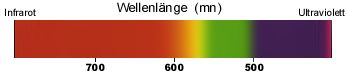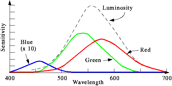 Im sichtbaren Spektrum kann das menschliche Auge zwischen verschiedenen Wellenlängen monochromatischen Lichts unterscheiden. jede Wellenlänge erzeugt einen anderen Eindruck, die Farbempfindung. Die Art, wie das menschliche Auge auf Licht reagiert, weist einige interessante Aspekte auf, z. B., daß zwei verschiedene Wellenlängen nicht als verschiedene Farben erscheinen. Zwei monochromatische Quellen mit genau der gleichen Intensität erwecken einen anderen Eindruck von 'Leuchtdichte'. Das menschliche Auge reagiert auf bestimmte Wellenlängen empfindlicher als auf andere. Mit anderen Worten, das Auge reagiert auf manche Farben empfindlicher als auf andere. Unser Auge reagiert empfindlicher auf Gelb oder Gelbgrün als etwa auf Rot oder violett.