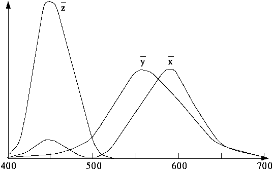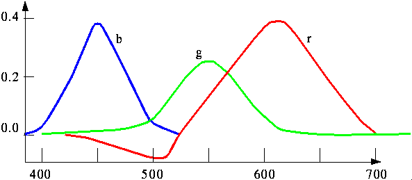 Betrachtet man Farben nur im Hinblick auf ihren Farbton und nicht auf Helligkeit und Sättigung, so liegt die Wellenlänge zwischen zwei gerade noch als unterschiedlich zu erkennende Farben zwischen 2 nm und 10 nm, je nachdem aus welchem Wellenlängenbereich die Farben stammen. Zur Codierung einer Farbe sind so 3 x 8 = 24 Bit ausreichend. Das folgende Diagramm zeigt die Spektren der (reinen) Grundfarben, die man addieren kann, um alle sichtbaren Farben darzustellen. Ein negativer Wert bedeutet dabei, daß die entsprechende Farbe nicht exakt darstellbar ist.