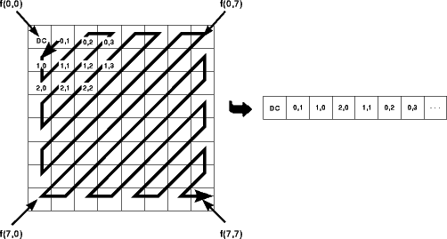 Die Codierung der quantisierten Koeffizienten erfolgt getrennt für DC- und AC-Koeffizienten. Aus den 8x8 Blöcken wird ein sequentieller (eindimensionaler) Bitstrom von 64 Integers erzeugt. Dabei ist der erste Wert der DC-Koeffizient, allerdings wird nicht der originale Wert, sondern, die Differenz zum DC-Koeffizienten im vorhergehenden Block codiert. Durch die Kohärenz der DC-Koeffienten ergeben sich auch hier wieder wesentlich kleinere Zahlen, als bei der Speicherung der absoluten Werte. Die 63 AC-Koeffizienten werden anhand einer Zick-Zack-Kurve in sequentielle Reihenfolge gebracht, wodurch eine Sortierung hin zu höheren Ortsfrequenzen entsteht. Da aber gerade die hohen Frequenzanteile oft sehr klein bzw. Null sind, entsteht eine für die weitere Kompression der Bilddaten günstige Reihenfolge.