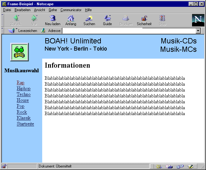 Mit Hilfe eines Tricks im Kopf einer HMTL-Datei können Sie mehrere HTML-Dokumente automatisch nacheinander anzeigen lassen (Dia-Show-Effekt). Dieser Trick ist vor allem in Verbindung mit Frames praktisch. So können Sie z. B. in einem Frame Information anbieten, während in einem anderen Frame automatisch Bilder in abwechselnder Folge angezeigt werden. Mit dem HTML-Tag