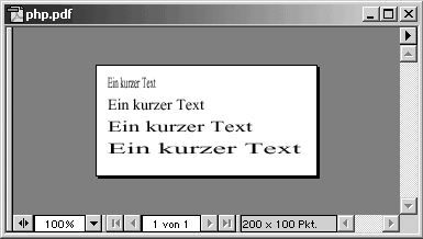 Mit pdf_set_horiz_scaling() kann man den horizontalen Skalierungsfaktor (Skalierung in %) für Textausgaben in einem PDF-Dokument (PDF-Dokument) festlegen. Jede Schrift wird normalerweise mit einem Original-Skalierungsfaktor von 100% gezeichnet. Im unteren Beispiel wurde der Text jeweils mit 50%,100%,150% und 200% in das PDF-Dokument geschrieben. Durch die Skalierung erreicht man, dass die Schrift gestaucht oder gestreckt wird. Es ist zu berücksichtigen, dass diese Funktion seit der PHP-Version 4.0.2 als "deprecated" gilt und in späteren Versionen nicht mehr verfügbar sein wird. Sie sollten daher in Zukunft die Funktion pdf_set_value() nutzen und dort als zweiten Parameter "horizscaling" einsetzen.