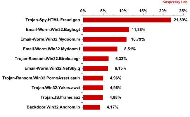 Der Anteil der Detektionen unseres traditionellen Spitzenreiters Trojan-Spy.HTML.Fraud.gen ging im September zwar drastisch zurück, dennoch belegte dieser Schädling nach den Ergebnissen des Quartals mit großem Abstand zu den anderen Schadprogrammen den ersten Platz. Mehr als ein Fünftel aller Alarme von Kaspersky Mail-Antivirus entfielen im dritten Quartal 2012 auf dieses Programm. Zur Erinnerung: Trojan-Spy.HTML.Fraud.gen ist ein Schadprogramm in Form einer HTML-Seite, das als Registrierungsformular einer Finanzorganisation oder irgendeines anderen Dienstes daherkommt. Die auf einer solchen Seite eingegebenen Registrierungsdaten werden an die Cyberkriminellen gesendet. Dieses Schadprogramm wird von Phishern eingesetzt.