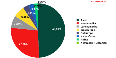 Bei der Verteilung der Spam-Quellen nach Regionen stieg aufgrund der aus den USA stammenden Spam-Menge der Anteil von Nordamerika mit einem Plus von 15 Prozentpunkten deutlich an, wobei der Anteil Asiens nach wie vor auf hohem Niveau ist: Fast die Hälfte des Spam-Aufkommens stammt von Computern in dieser Region. Westeuropa überholte Osteuropa, landete auf dem vierten Platz und näherte sich damit den Werten von Lateinamerika an.