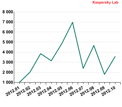 Im Jahr 2012 fügten unsere Antiviren-Experten den Datenbanken von Kaspersky Lab 30 Prozent mehr Signaturen zur Erkennung verschiedener Mac-Trojaner hinzu als im Jahr 2011. Verglichen mit dem Jahr 2010 hat sich die Anzahl der pro Jahr hinzugefügten Signaturen versechsfacht.