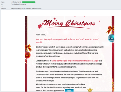 Einige Spam-Versendungen sind als Grußkarten aufgemacht, die neben guten Wünschen auch Werbung enthalten. Die kreativsten Mitteilungen kommen als hübsche Weihnachtskarten daher. Bei den Produkten, die auf diese Weise beworben werden, handelt es sich z.B. um verschiedene mobile oder Internet-Anwendungen – die unter Umständen nicht das Geringste mit Weihnachten oder Neujahr zu tun haben.